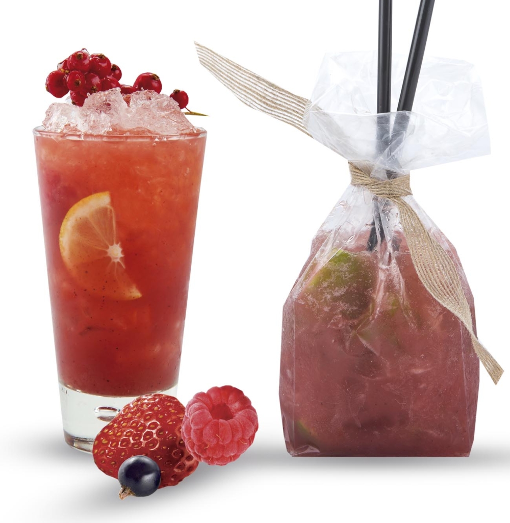 Mezclamos con una cuchara de bar, colocamos la decoración, pueden ser frambuesas o moras y servimos con una pajita.