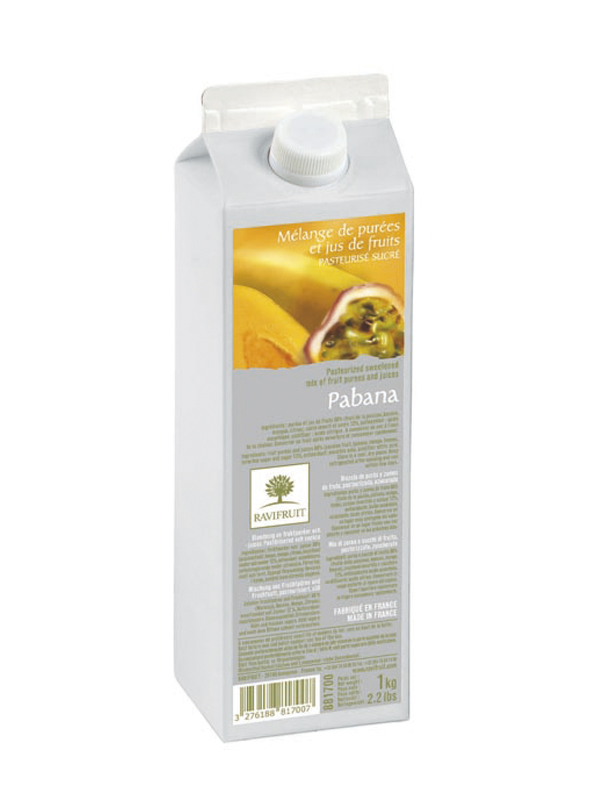 Puré ‘pabana’ compuesto por maracuyá, mango, banana y limón. El mix de frutas más exótico. Contenido del 90% de fruta. Para la elaboración de  Cócteles –con o sin alcohol-, Smoothies, Sorbetes, Cremas, Batidos, Helados, Granizados y Gelificados. Te proporcionamos todas las recetas para la elaboración de tus preparados. El equilibrio perfecto entre lo dulce y lo ácido. ¡Espectacular!